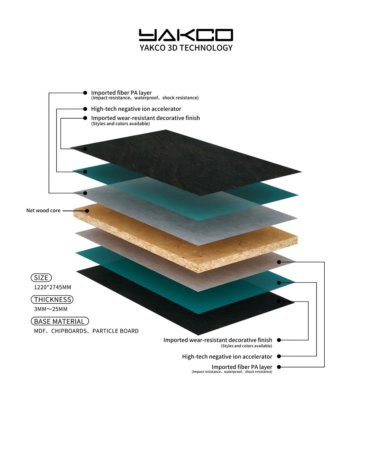 나뭇결이나 돌 패턴과 같은 자연스러운 질감이든 추상적인 기하학적 패턴과 예술적인 질감이든 모두 3D 기술을 통해 생생하게 렌더링될 수 있으므로 디자이너에게 다양한 디자인 요구 사항을 충족할 수 있는 더 넓은 창의적 공간을 제공합니다. 특히 내부 벽, 칸막이 장식, 가구, 캐비닛 표면 등에 사용할 수 있습니다.