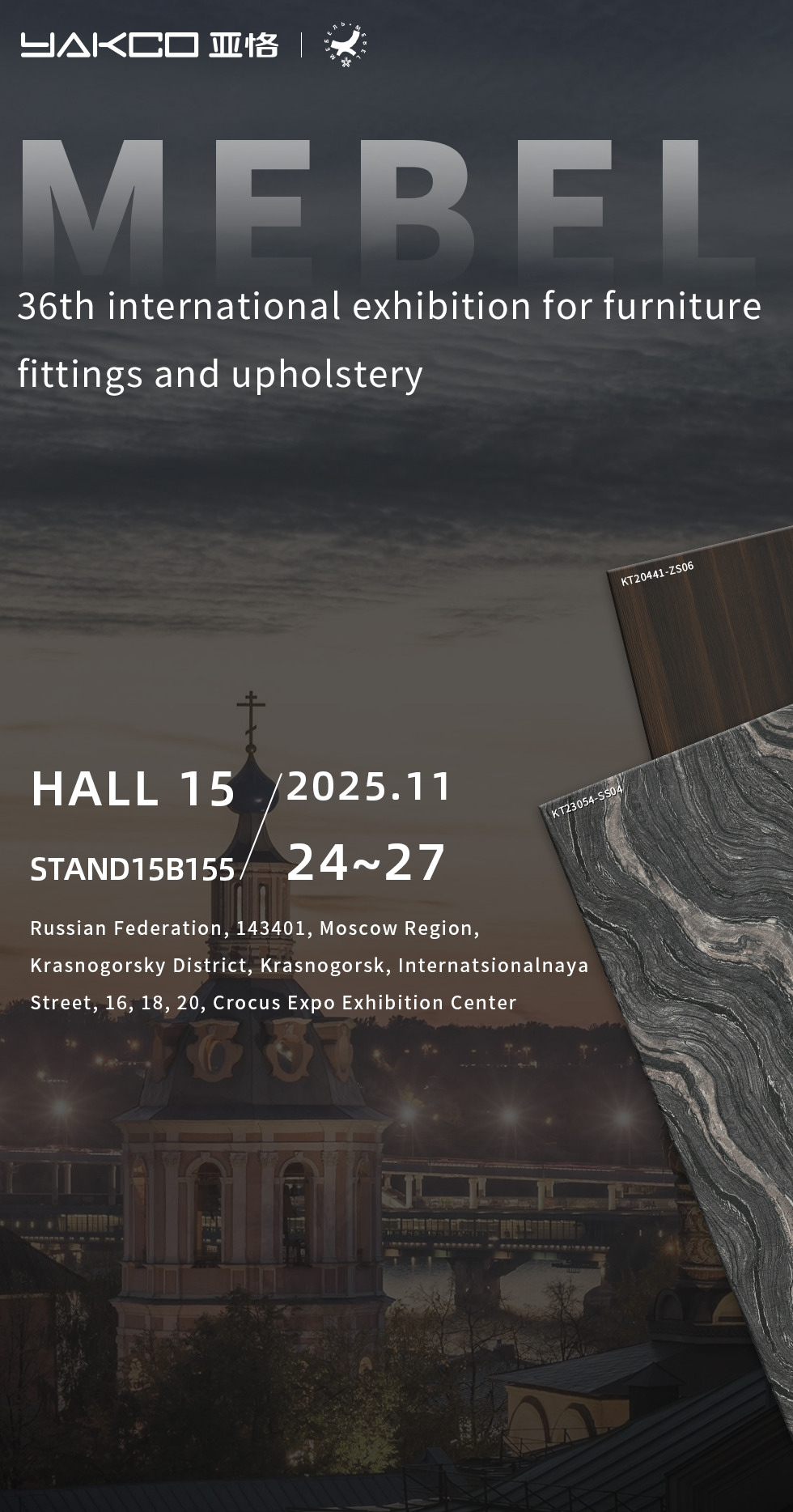 YAKCO New Materials (Jiangsu) Co., Ltd.는 러시아 모스크바에서 개최되는 제36회 국제 가구 부속품 및 실내장식 전시회(MEBEL)에 참가한다고 공식 발표했습니다. 이번 전시회는 11월 24일부터 11월 27일까지 진행되며, 회사는 15B155번 부스에서 전 세계 관람객을 맞이할 예정이다.